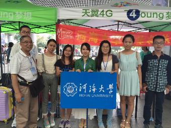 下午我们有了一定的工作经验:安排了三人负责在出站口手举河海大学引导牌,在第一时间将新生及家长聚集,避免他们在偌大的车站广场走弯路;安排两人负责将家长及新生引导至河海大学新生接待处,提供休息座椅与饮用水;剩余三人负责在人数达到一定数目后,带领其乘坐河海大学专车前往江宁校区报道。