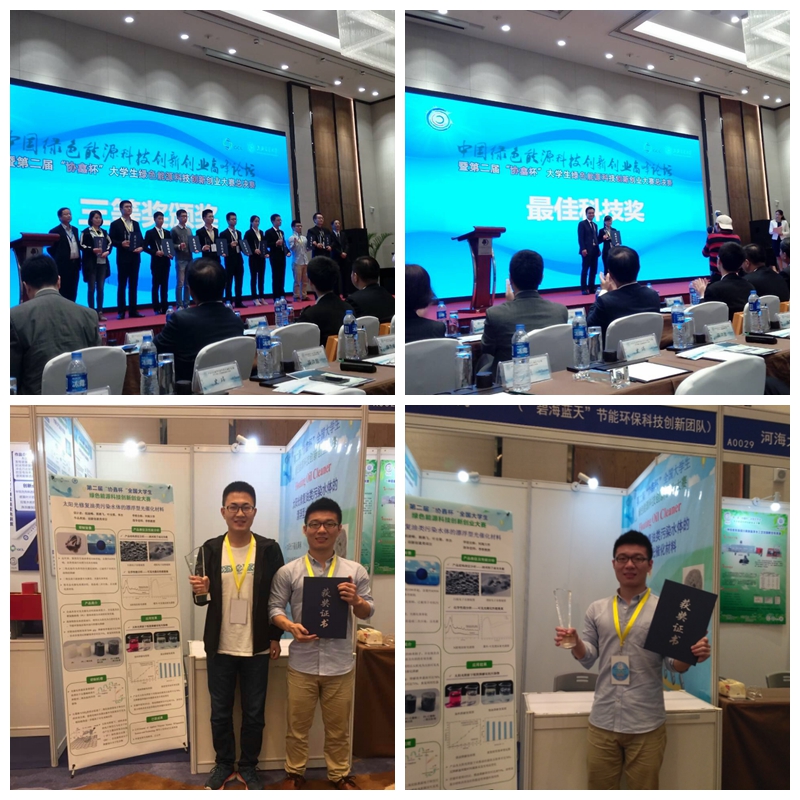 云顶国际yd333倪凌峰等同学在李轶老师指导下,以作品“用于可见光原位修复油类污染水体的漂浮型光催化材料”荣获大赛三等奖;蔡炎等同学在陈卫老师指导下,以作品“一种低能耗强磁分离除藻净水工艺及藻醇发电装置”荣获本次大赛“最佳科技奖”。