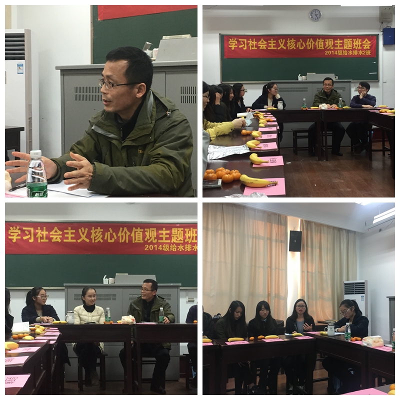 今天是2016年12月1日,在2016年的尾声,14级给排水2班,于工程馆108教室召开了“学习社会主义核心价值观”主题班会暨团日活动。出席本次活动的嘉宾有:云顶国际yd333党委书记笪学军老师,14级环境院辅导员曾莉老师。