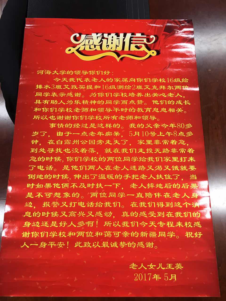 2017年5月15日,河海大学收到来自一位老人家属的感谢信,信中表达了他们对河海大学2016级给排水科学与工程3班艾孜买提·布都热合曼和2016级测绘2班艾克拜尔两位同学的感激之情。