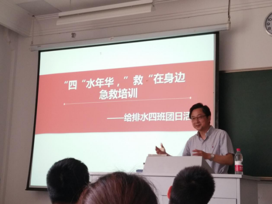 为更好的培育和践行社会主义核心价值观,同时积极响应2017年江苏省卫生计生委重点工作目标要求,提升大学生应急素养和急救互救能力,培养出更多具备较高综合素质的青年志愿者,2014级给排水四班团支部于2017年6月2日开展了以“四”水年华,“救”在身边为主题的团日活动。为此,特地邀请了河海大学校医院副院长马红兵前来详细讲解各项急救知识,同时还邀请前河海大学红十字会成员陈立豪进行实际操作演练。