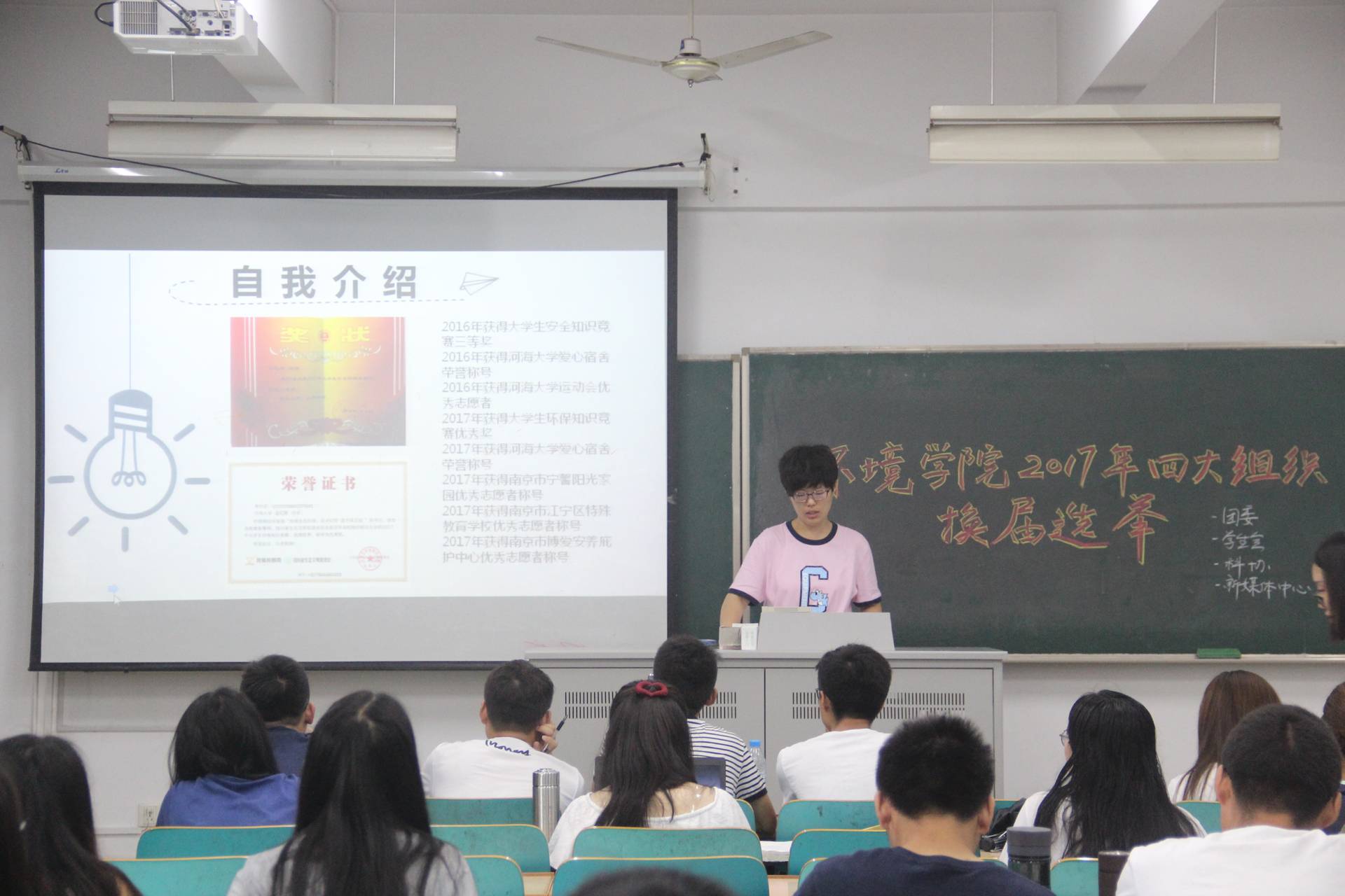 6月23日上午九点于致高216进行了部长副部长的竞选答辩。金意倩老师担任本次答辩的评委。同学们提前签到、拷好PPT后,按照团委、学生会、科协、新媒体中心的顺序依次进行答辩。每个答辩人都表现的精神抖擞,落落大方,将自己最好的一面展现给了各位评委,结束后同学们也给予了热烈的掌声。6月28号上午8:30于致用304教室进行了四大组织主席团的答辩。本场答辩的评委由曾莉老师和王剑老师担任。同学们答辩结束后老师依据答辩内容进行相应的提问。