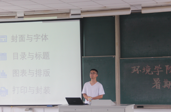 李聪同学则具体说明了实践过程中对照片、新闻稿、开通的微博、微信公众平台等具体的要求,最后评奖评优的评定标准和细节,以及发票报销的注意事项。团委副书记杨刚同学从团队总结和调查报告的封面与字体、目录与标题、图标与排版、打印与封装四个方面进行相关细节的讲解,并进行了些技巧的展示,给同学们日后总结的撰写奠定了一定的基础。