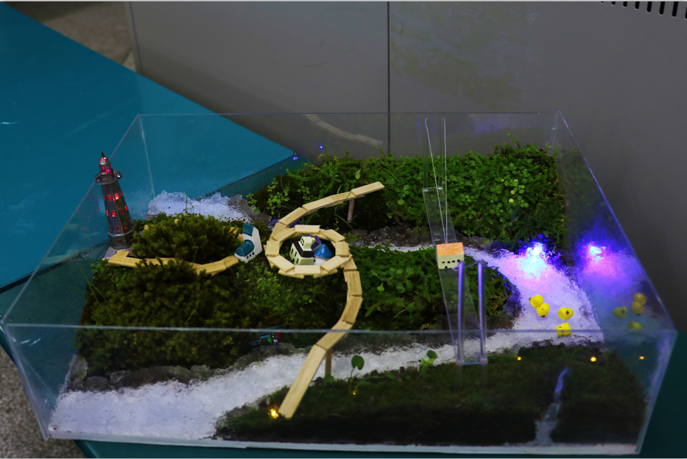 经过两周的努力,来自各学院的16个小组带着自己引以为豪的作品来到了比赛场地。通过ppt讲解,参赛选手们将自己的作品展示给大家。参赛的每个作品都十分精致,其中内涵也发人深思;而关上灯后,各种绚烂的灯光更是令人惊叹。其中“海绵城市生态造景”使用天然植物,创新地将园艺造景与单片机编程综合应用在沙盘模拟中;“4034”通过强烈对比,借未来之景来警示人们保护环境,其制作之精致让人叹为观止;而“孤岛之声”则是构建了一幅安逸美好的画面,黑暗中的灯光也美轮美奂。这三个作品给评委和观众们留下了深刻的印象。