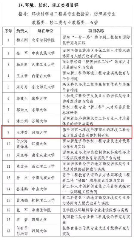 近日,教育部办公厅公布首批“新工科”研究与实践项目名单,我校推荐申报的5个项目全部入选。其中,我院王沛芳教授负责的“基于国家水环境治理需求的环境工程专业设置及动态调整机制研究”项目成功入选。