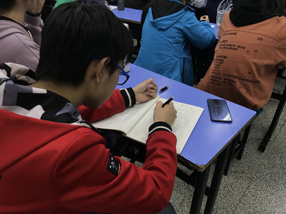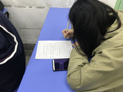 老师带着大家感受书法作品的魅力后,从最基础的笔画书写开始讲解,让同学们真正拿起笔自己实践体验。遇到难以体会的地方,老师会在黑板上示范,然后再让同学在草稿本上书写模仿,体验笔下的力度和走势。在笔画的教学后,老师让同学们将笔画运用在完整的字的书写里,感受字体的变化,并多加练习。