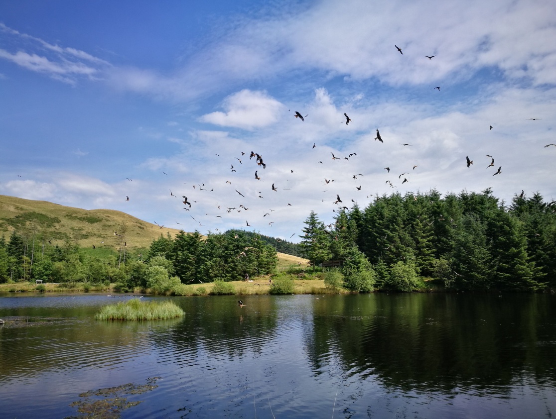 下午,我们外出去到了“Nant y Arian”,这里以对“red kite”的保护闻名。在过去的一段时间内,此种鸟类处于濒危状态,因此英国人每日定时在此投食以喂养它们,希望它们能够顺利繁殖。此地虽然天气潮湿,但仍适合它们栖息。我们在下午三点见到了鸟类一拥而上抢夺食物的画面,十分壮观。随后我们围着 湖畔漫步,欣赏到了此地美丽的景色。