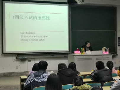 在主持人的简单介绍后,黄老师便在同学们热烈的掌声中走上讲台,并开门见山的提出了今天讲座的三个主要内容:考四级的重要性、为什么要考四级、怎么考四级。
