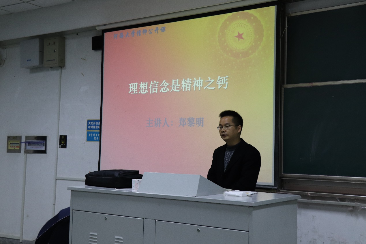 2018年12月4日3:50,河海大学云顶国际yd333在致高A116教室举办“信仰公开课”系列讲座。本次讲座邀请了河海大学马克思主义学院的郑黎明副教授作为主讲人,郑教授围绕“理想信念是精神之钙”这一主题,从其内涵等方面讲述了信念对于当代大学生的重要性,并且为同学们今后的学习和生活提出了一些建议。