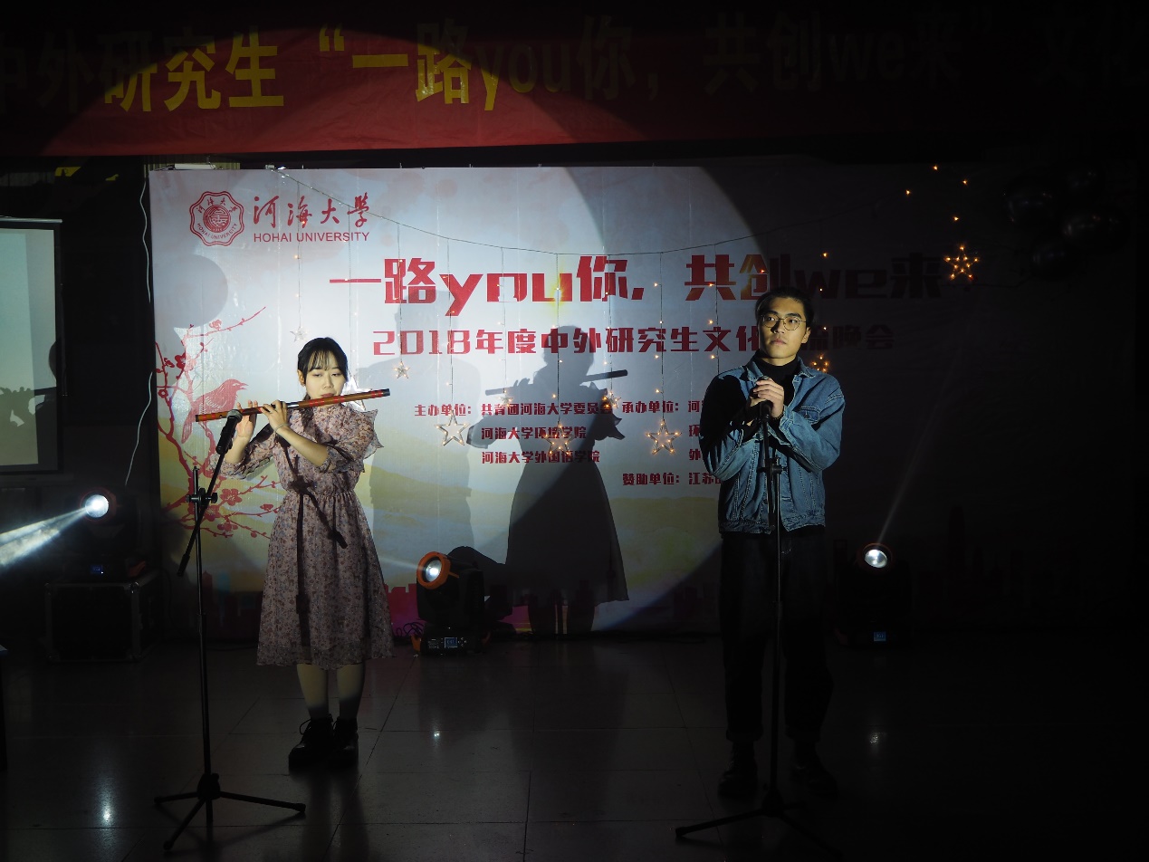随着动人而熟悉的歌声响起,晚会在我院袁强同学婉转而激情的《LOVE STORY》歌声中拉开了帷幕。表演结束后晚会正式开始,首先由董丽平同学为大家带来琵琶演奏曲目《大鱼》,曲声悠扬,深受观众同学的喜爱。由M.H.Shalehy 沙恒带来的歌曲《Gaankobi》成功延续了首个节目的精彩,其歌喉动人深情,引得台下观众的悉心聆听。表演结束后进入了本次晚会的第一个游戏环节,“听歌识曲”,台下同学积极参与,使晚会气氛变得更加火爆,赢得比赛的小组也获得了精美奖品。轻松愉悦的互动游戏告一段落后,紧接着是紧张刺激的双截棍表演《棍舞狂沙》,由夏孟杰,赵沂等人带来,其娴熟的棍法使人眼花缭乱,引得台下观众尖叫连连,将气氛推向一个小高差。随后由孔孟带来的歌曲《笃爱》又将观众带回了悠扬动情的氛围中。歌曲结束后进入了晚会的第一次抽奖环节,抽出的幸运观众获得本次晚会三等奖。器乐表演《我们的时光》是由徐豪,王一欣,苏子宽为大家带来的,展现了我校学生的多才多艺,伴随着乐曲声的响起,同学们不禁回忆起在学校里的点点时光。下一个节目是由留学生Arup Chakraborty带来的诗朗诵《In the time of fever/An old friend》,其富有感情的朗读似乎将观众带入了其编织的故事,深入人心,获得大家热烈的掌声。朗诵结束后进入了本次晚会的第二个游戏环节,《你画我猜》,参加游戏的四名观众以及四名留学生观众被分为多个小组,一一进行游戏,其热闹有趣的节奏将本次晚会推向了又一高潮。随后张玲玉和周放同学为大家又带来了笛子演奏《不染》,笛声与歌声交相呼应,亦柔亦刚,将全场带回平静而又温暖的氛围中。结束后进行了本次晚会的第二次抽奖活动。四位留学生带来的舞蹈表演《Traditional Water Festival Dance of Myammar》是关于缅甸传统节日泼水节的,舞蹈中充满着美好祝福,婀娜的身姿、满溢的笑容散发着对生活的热爱。成瑾、郭雨灵同学带来的歌曲《如果这就是爱情》,其感性的嗓音唱出对爱情的看法,萦绕心头,久久盘旋。晚会的最后一次抽奖活动随后进行,获奖的同学获得了晚会的最终大奖。抽奖结束,Waseem Shah. And Umer带来了巴基斯坦文化音乐,是用一种叫做Rabab的古老乐器演奏,其声音给人以内心的平静和放松。晚会由最终的T台秀收尾,表演同学的步伐牵动着每位观众的心弦,留下了我们最美好的纪念。