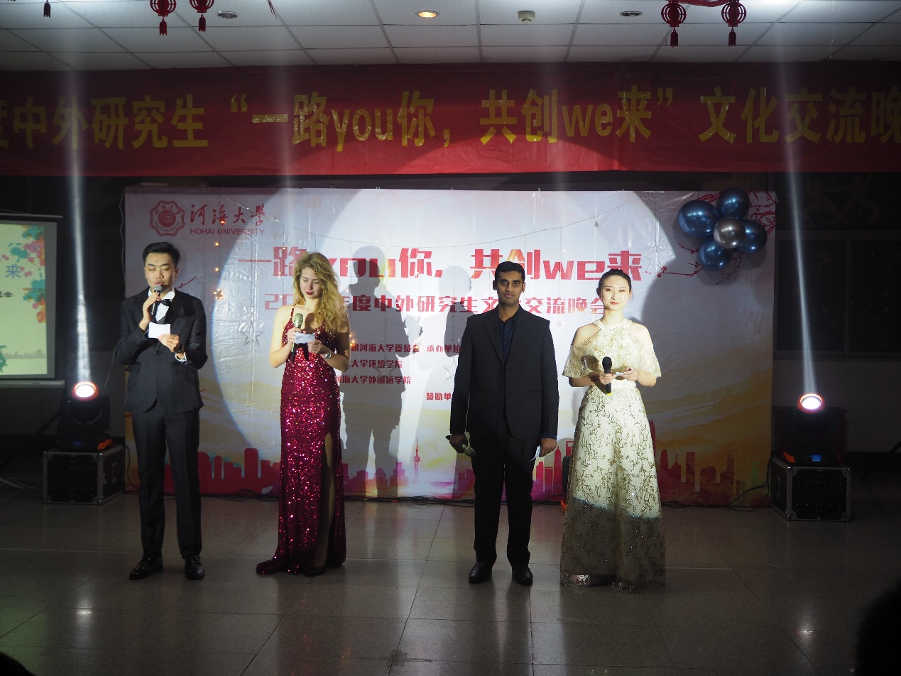 2018年12月8日晚18:30,在河海大学鼓楼校区学生城举办了主题为“一路you你,共创we来”河海大学中外研究生交流晚会。此次晚会由共青团河海大学委员会、河海大学云顶国际yd333、河海大学外国语学院主办,河海大学研究生会、云顶国际yd333研究生会及外国语学院研究生会承办,旨在丰富同学们课余生活,加强不同国家间的文化交流,推动学校文化活动的蓬勃发展,给各国同学们一个真正展示自我风采和文化交流的舞台。参加晚会的嘉宾有云顶国际yd333研究生导员高臣老师和16级云顶国际yd333主席团的师兄师姐,以及各学院研究生会主席。