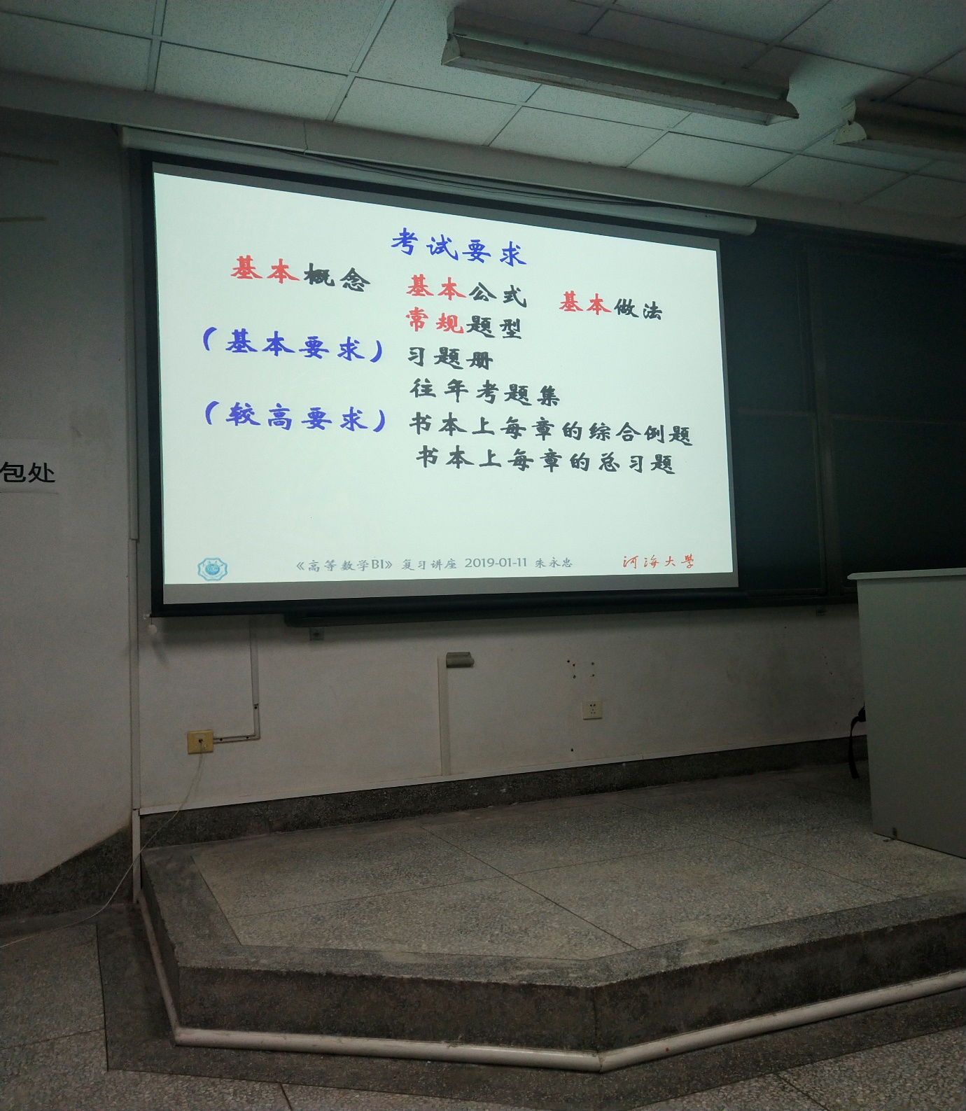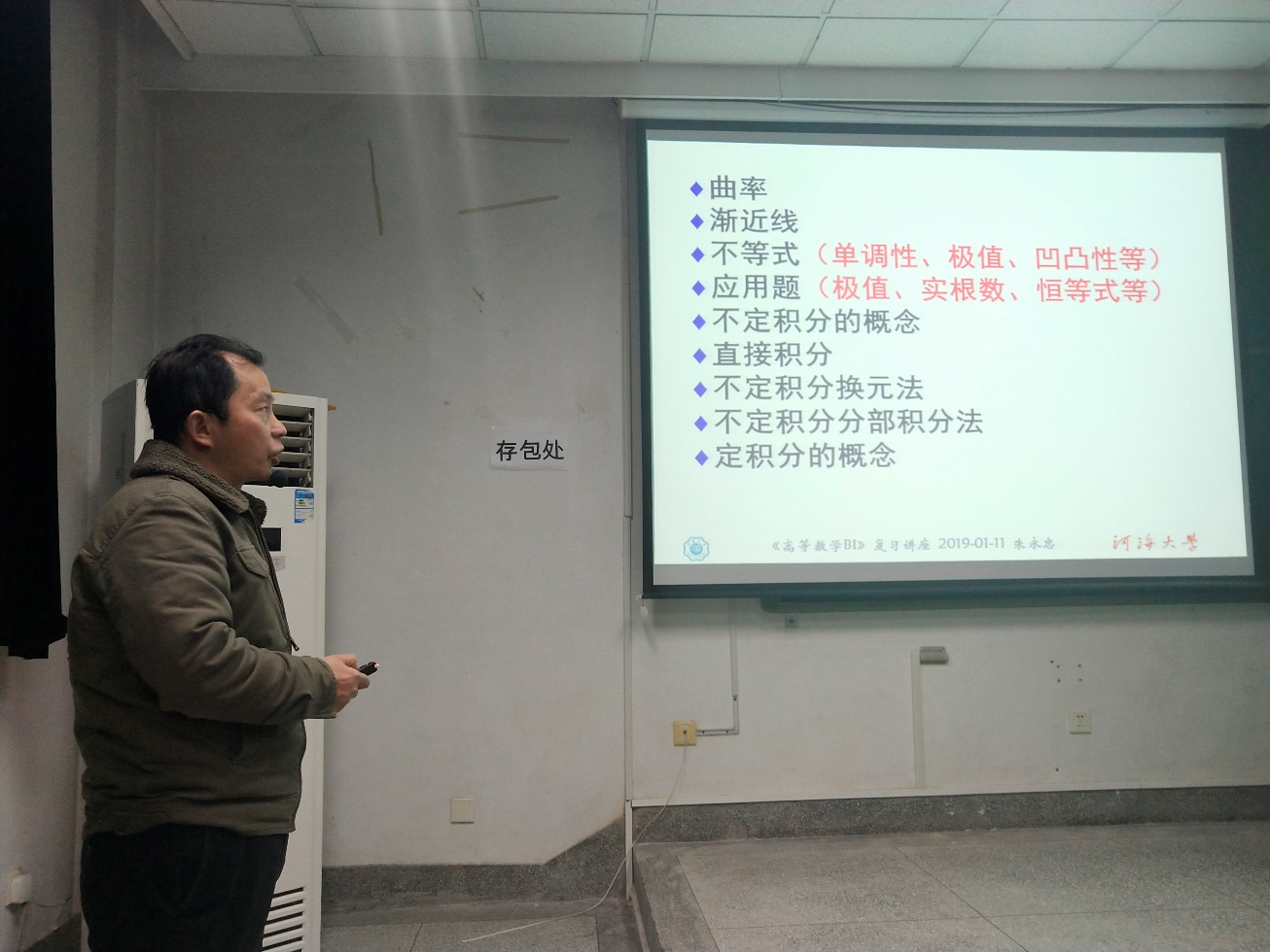 2019年1月12日晚18:30河海大学云顶国际yd333学生会学习部于致用楼117教室举办了2018级高数期末讲座。随着高数期末考试的来临,许多大一同学感到了考试的压力,所以学生会学习部特意邀请了教学经验丰富的朱永忠教授作为本次讲座的主讲人。幽默风趣的朱永忠教授在向大家进行了简单的自我介绍之后便进入了今天的主题。