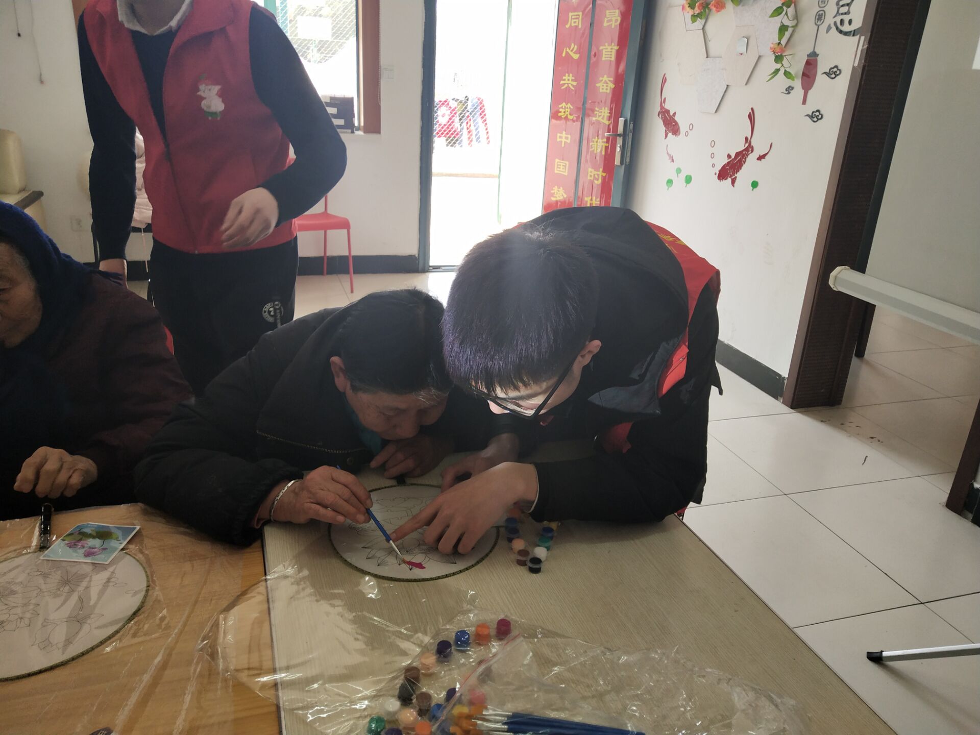 中午12点,志愿者们在东门地铁口集合,随后便乘车来到了东山街道邵圣社区居家养老服务中心。本次活动的主题是制作团扇。在老人到齐之后,志愿者们给老人们每人都分发了团扇及颜料。老人们在拿到了扇面及颜料之后,便开始了团扇的制作。老人们拿着图样,对比着效果图的颜色给扇面上色。志愿者们热心地给老人讲解着上色的方法,或是帮助着老人们在扇面上涂着各式各样的颜料。志愿者们与老人们亲切地交谈着,与老人们开心地互动,让老人们很是开心。很快,老人们的团扇便有原先单调的白色背景变成了五彩斑斓的生动画面。老人们对这次的团扇制作都十分满意。