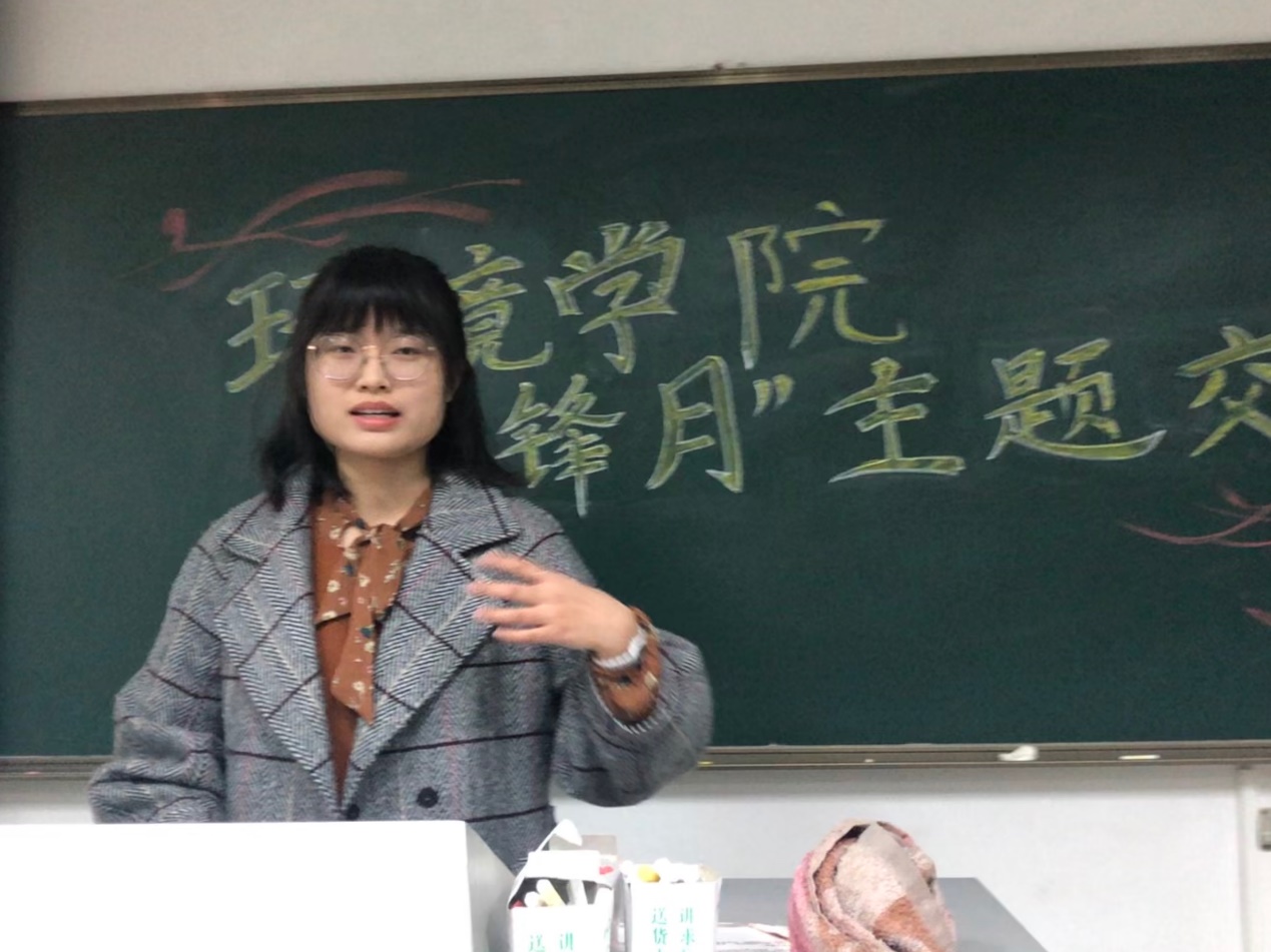 第二位是17级环境一班的王少伟同学。这位同学向我们详尽的阐述了暑期实践的意义和注意事项,令同学们收益颇深。首先是暑期实践的准备工作,同学们可以自主选题,尤其是可以选择一些对日后发展有益的活动。比如王同学选择了“海绵城市”这一主题,而海绵城市与生态环境息息相关。在实践过程中,王同学认为应当发挥雷锋的钉子精神,他在安徽省池州市(第一批进行海绵城市建设的城市之一)进行了调研,通过了解地表环境、使用材料异同、市政府对城市的环境规划、调蓄水池建设工程等,收集到繁杂丰富的数据。接着通过对信息数据的再处理,他使用直观的柱状图、饼状图以及数学建模的方式,向人们展示了该项目的成果。最后他将整个实践的成果进行了总结。