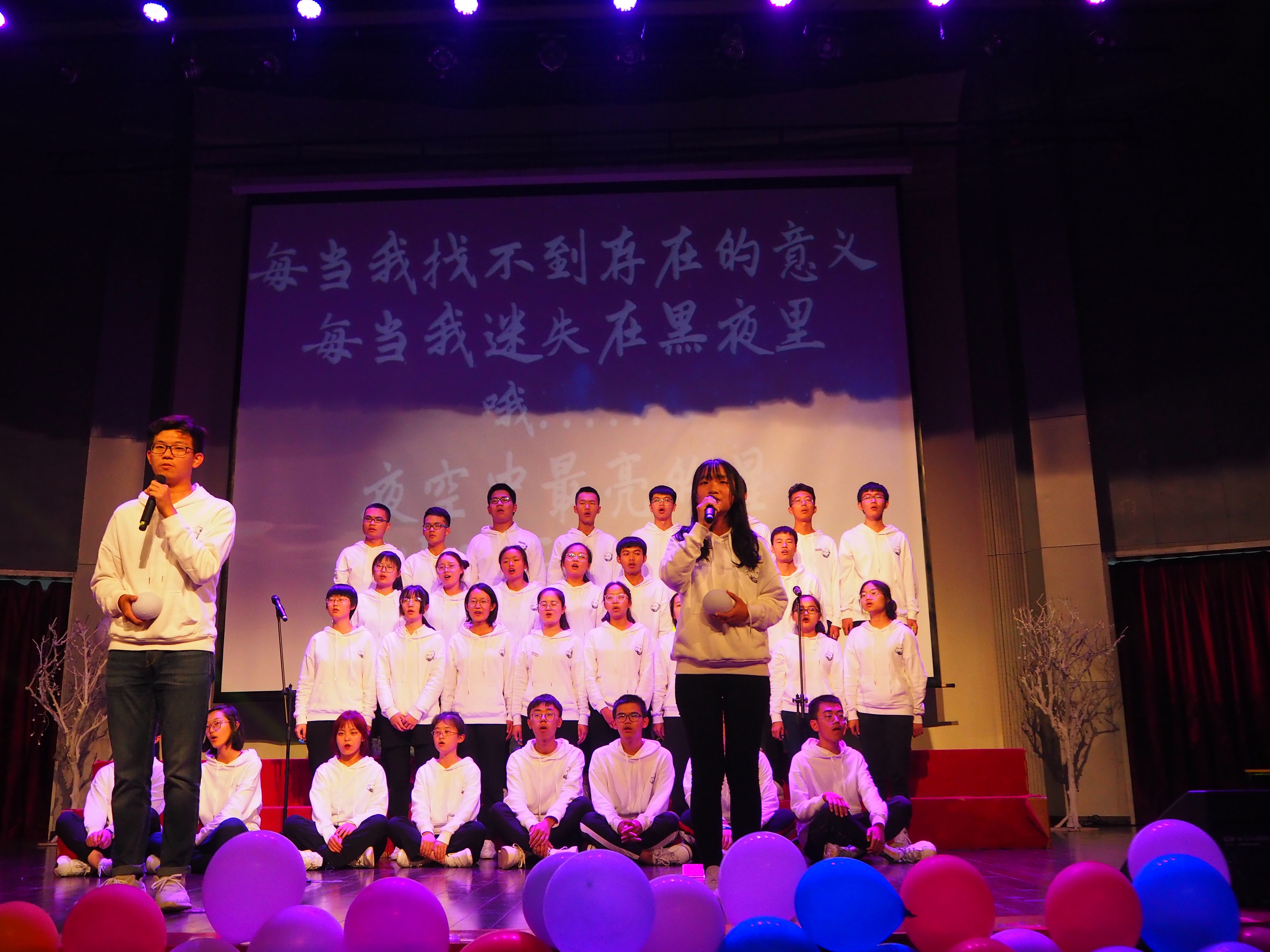 节目的最后,来自生态1班三十四名同学合唱了歌曲《夜空中最亮的星》。他们的歌声温柔真挚,做手语的同学熟练自然。在这温暖轻柔的歌声中,我们结束了2019级环境院迎新晚会。