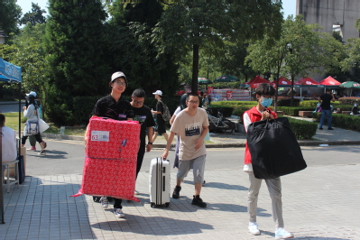 下午1:00,云顶国际yd333团委书记、2020级辅导员金意倩老师,2020级辅导员杨铮老师,2019级辅导员扈雅璐老师、程萌老师以及迎新志愿者们提前来到相应服务点准备迎接新生。从江宁校区南门到宿舍,新生全程都有由环境院安排的志愿者陪伴。志愿者热情地帮助新生运输行李并且细致地引导他们住宿报到。