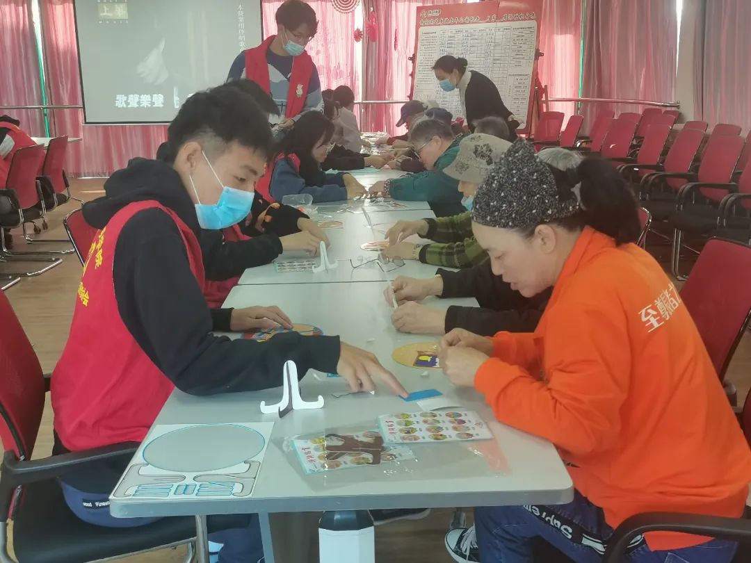 为了更好的服务敬老院的老人,志愿者们带来了各种各样的手工材料。在把桌椅和手工材料准备完毕后,伴随着欢快的音乐,志愿者们开始和老人们一起创作手工艺作品。面对不熟悉的老人们,志愿者首先引出话题,在倾心的交谈中慢慢与老人熟络起来。他们用耐心和热情感染着老人们,让老人们的脸上长伴笑容。虽然老人们的白发和皮肤上布满了岁月的痕迹,但她们的双手依旧灵巧。在与志愿者们闲话家常的同时,她们的双手也配合着志愿者的动作,将看似杂乱无章的纸片幻化成一件件美观的手工艺作品。在与老人们制作手工的过程中,志愿者们也准备了小节目,精彩的表演让老人们拍案叫绝,现场一度充满着欢声笑语。