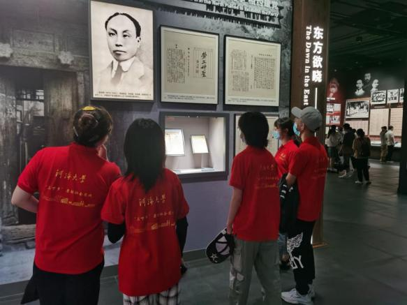 实践团成员一同登上烟雨楼,整个南湖尽收眼底,能够看到湖畔的的中共一大纪念船。在这里,成员们一起欣赏提前下载好的《南湖红船》,“嘉兴湖畔,烟雨楼前,停着一只红色的船,红的船桨,红的桅杆…”伴着悠激昂的革命歌曲,实践团仿佛看到了先辈们共聚江南、相约建党的场景,更加切身体会到中国共产党百年征程的艰辛与伟大。一踏入南湖革命纪念馆,震撼厚重的革命奋斗史就唤醒了实践团每一位成员心中的红色基因。纪念馆共三层楼,主旨突出,紧紧围绕“开天辟地”和“光辉历程”两大主题展开。