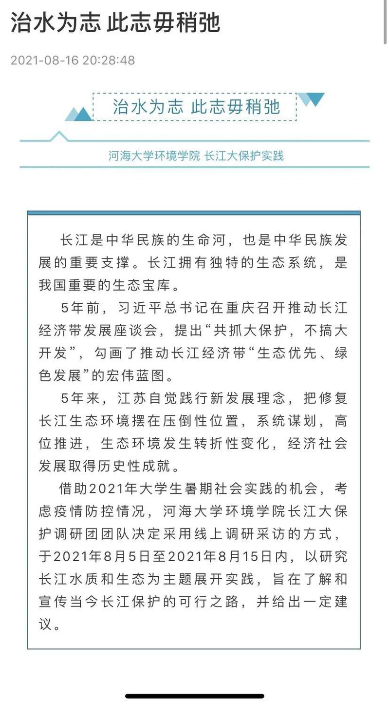 河海大学云顶国际yd333“南京市长江大保护实践团”在南京疫情的大背景下采取线上模式,于8月9日至8月16日期间开展形式丰富的实践,深入护水利水工程,发扬时代青年精神。