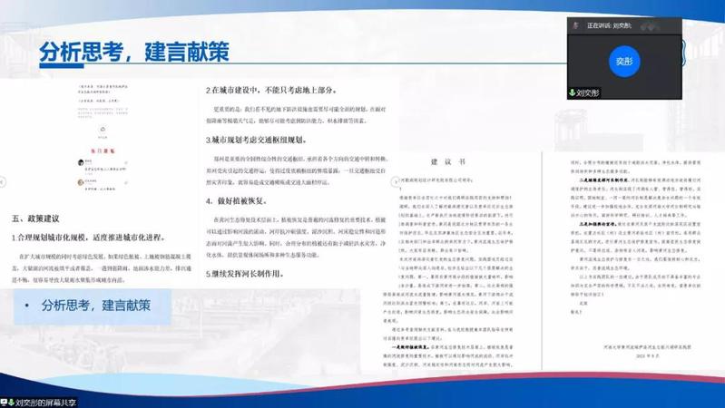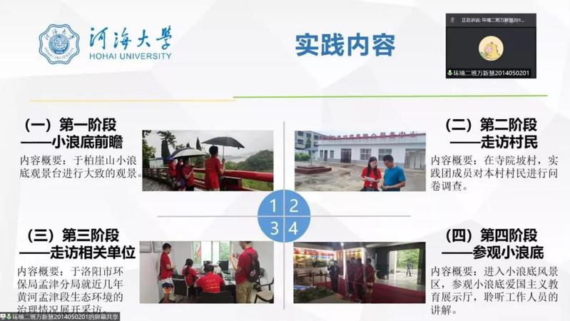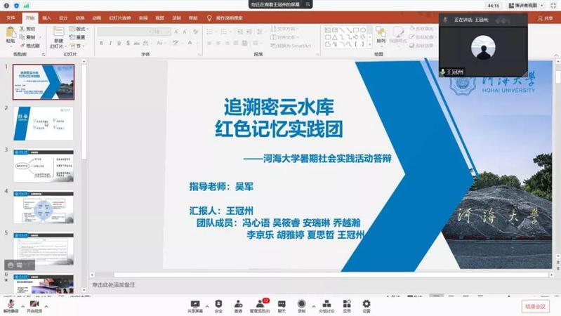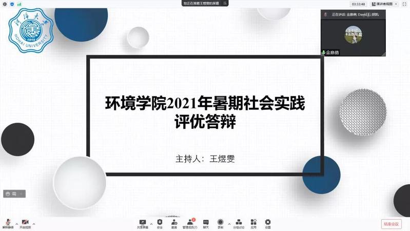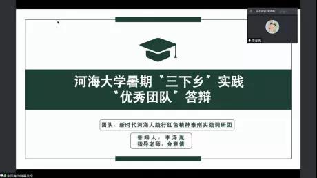 为推进落实云顶国际yd333暑期“三下乡”社会实践活动总结工作,2021年9月15日下午,河海大学云顶国际yd333举行了2021年暑期实践线上评优答辩。市政工程系胡凯老师,环境工程系王大伟老师,院团委书记兼20级辅导员金意倩老师、20级辅导员杨铮老师担任评委。疫情的特殊情况给今年的社会实践团带来了机遇和挑战。虽然大部分团队的队员都居住在不同的地方,给线下活动带来了不便,但是实践团使用了线上会议、网上问卷、就近走访等多种途径解决问题,并且顺利地完成了实践活动。线上答辩由团队借助PPT形式进行实践总结以及评委提问两个环节组成。主持人王煜雯同学简要地介绍了此次答辩的背景和评选标准后,答辩正式开始。