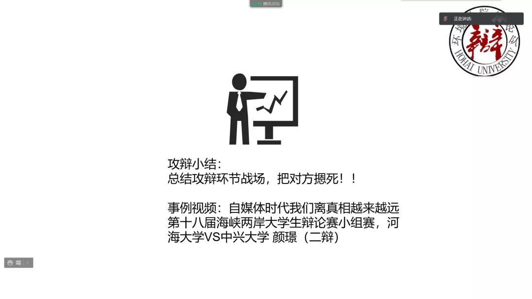 10月6日上午10:00点,美育课堂演讲课负责人王藤锦与助教田畅为同学们开展了一堂线上的演讲与辩论课。首先王藤锦为同学们简单介绍了演讲与辩论的基本概念,帮助同学们对这两种语言艺术形式有个大致的认知,接下来介绍了二者的异同之处以及演讲与辩论的意义所在。接下来主持人放了一段辩论赛的视频:第十八届海峡杯大学生辩论赛:河海大学VS中兴大学,以此作为示例为大家讲解了辩论赛的具体赛程以及辩论场上四名辩手的主要辩论流程,让同学们对于辩论有更清楚的认知。