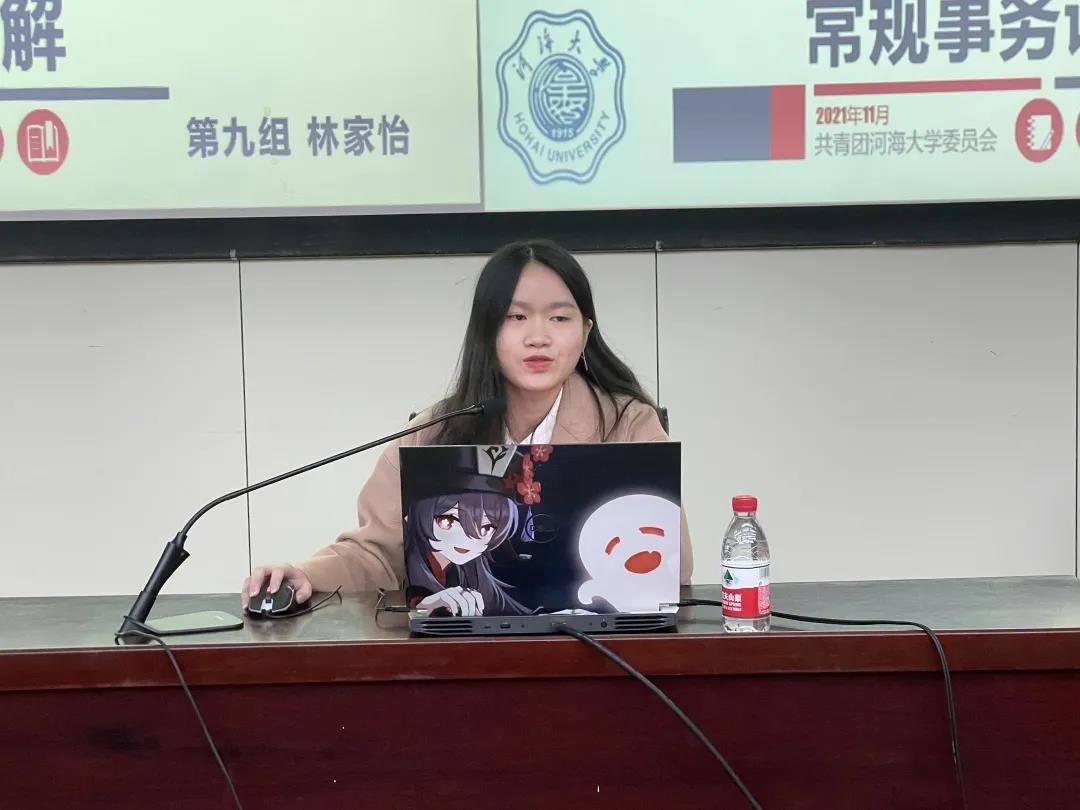 会议第二节,院团委副书记、20级本科生林家怡同学对校车乘坐、教室申请以及pu平台的具体使用等常规事务进行了全面的讲解。