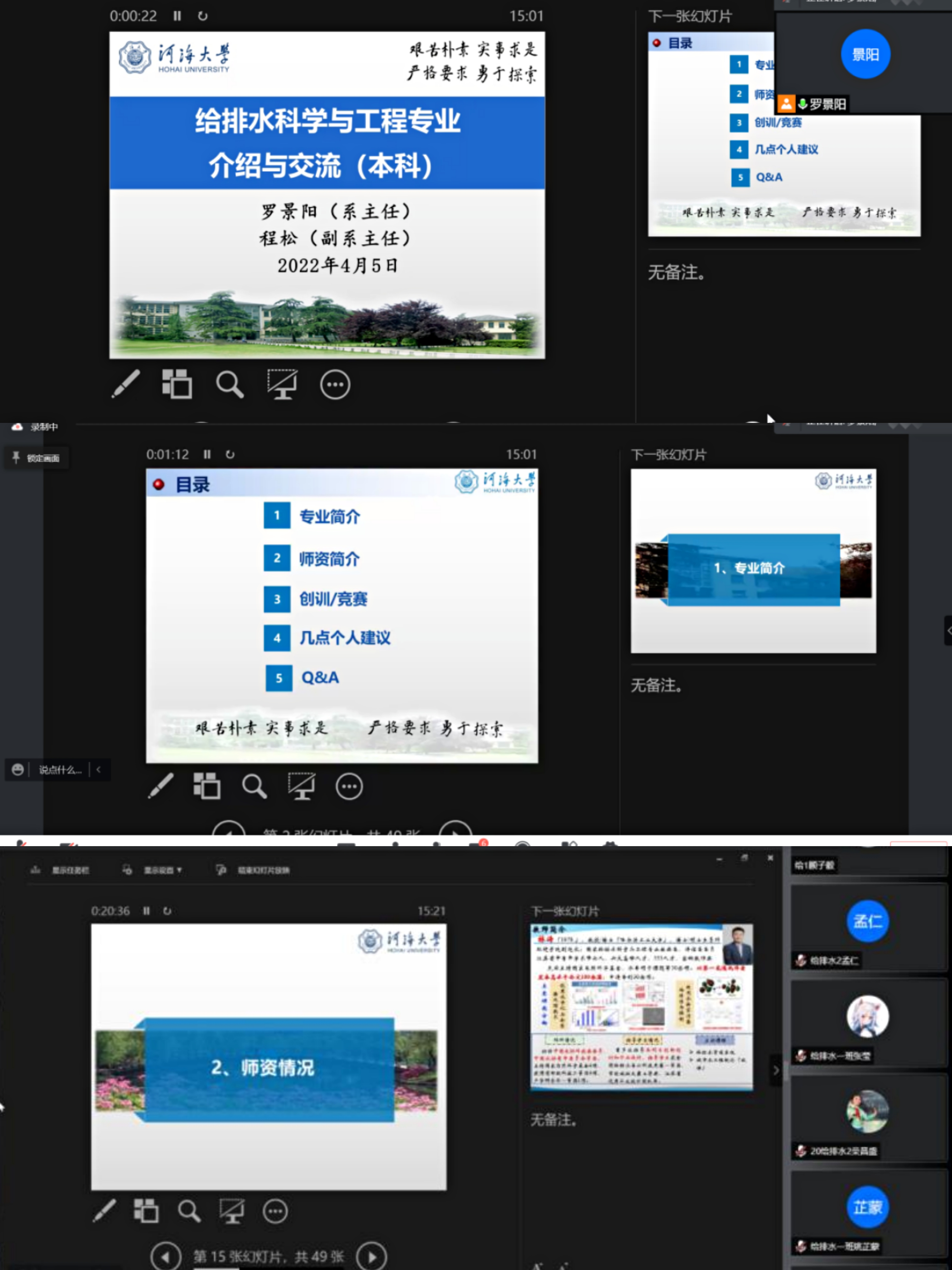 4月5日,云顶国际yd3332020、2021级给排水专业在线上召开学习经验交流会。本次交流会邀请到河海大学云顶国际yd333市政工程系系主任罗景阳教授为同学们分享经验,答疑解惑。罗景阳老师围绕专业简介、师资简介、创训竞赛、个人建议和问题交流五个方面向同学们进行了全面深入的介绍。