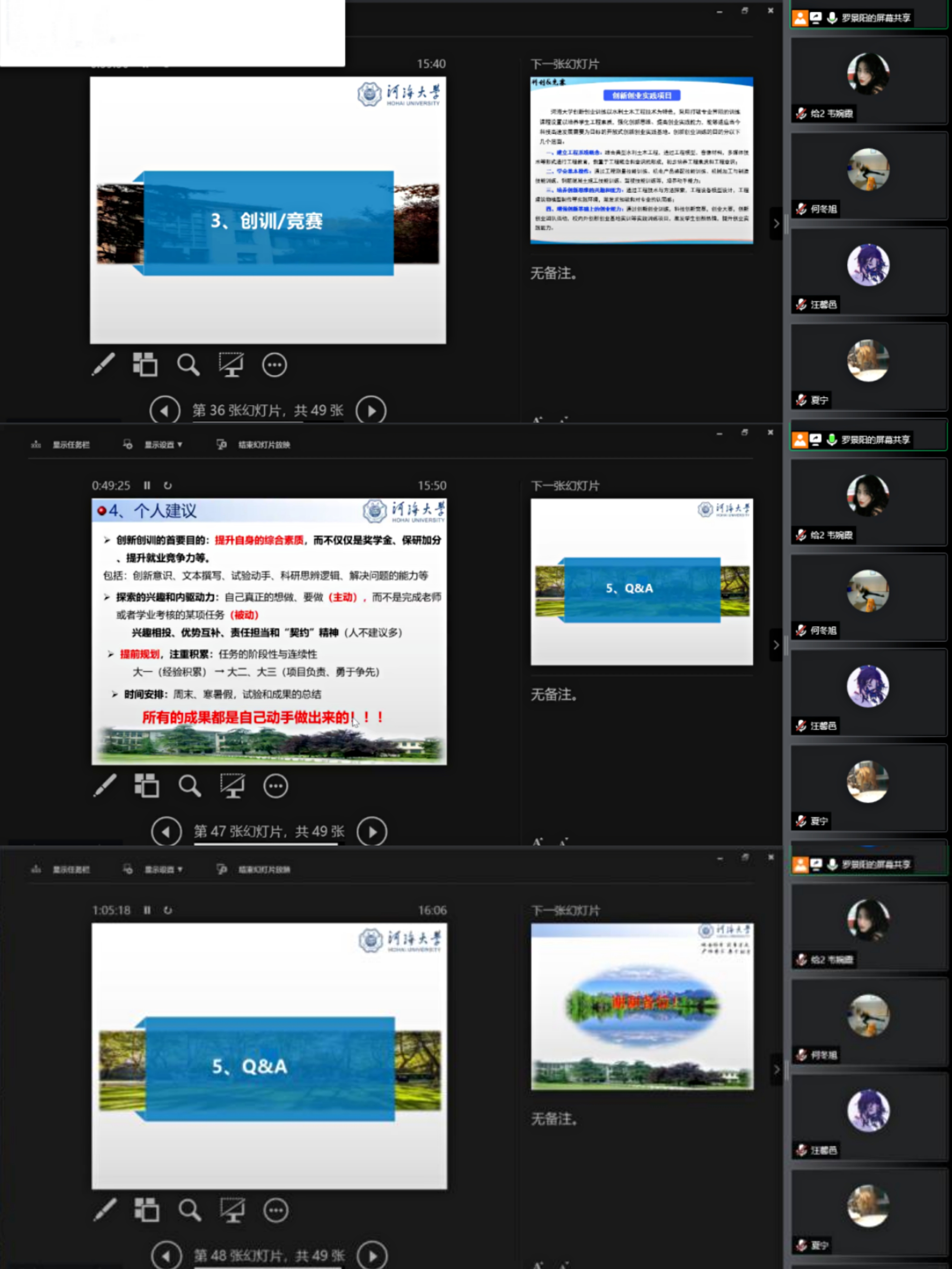 罗景阳老师以项目介绍与案例分析为切入点,为同学们罗列科创竞赛时间轴。罗老师提出要明晰时间节点,为赛事做好充足的准备工作,最后向同学们展示了学长学姐们创新创业的主要成果。