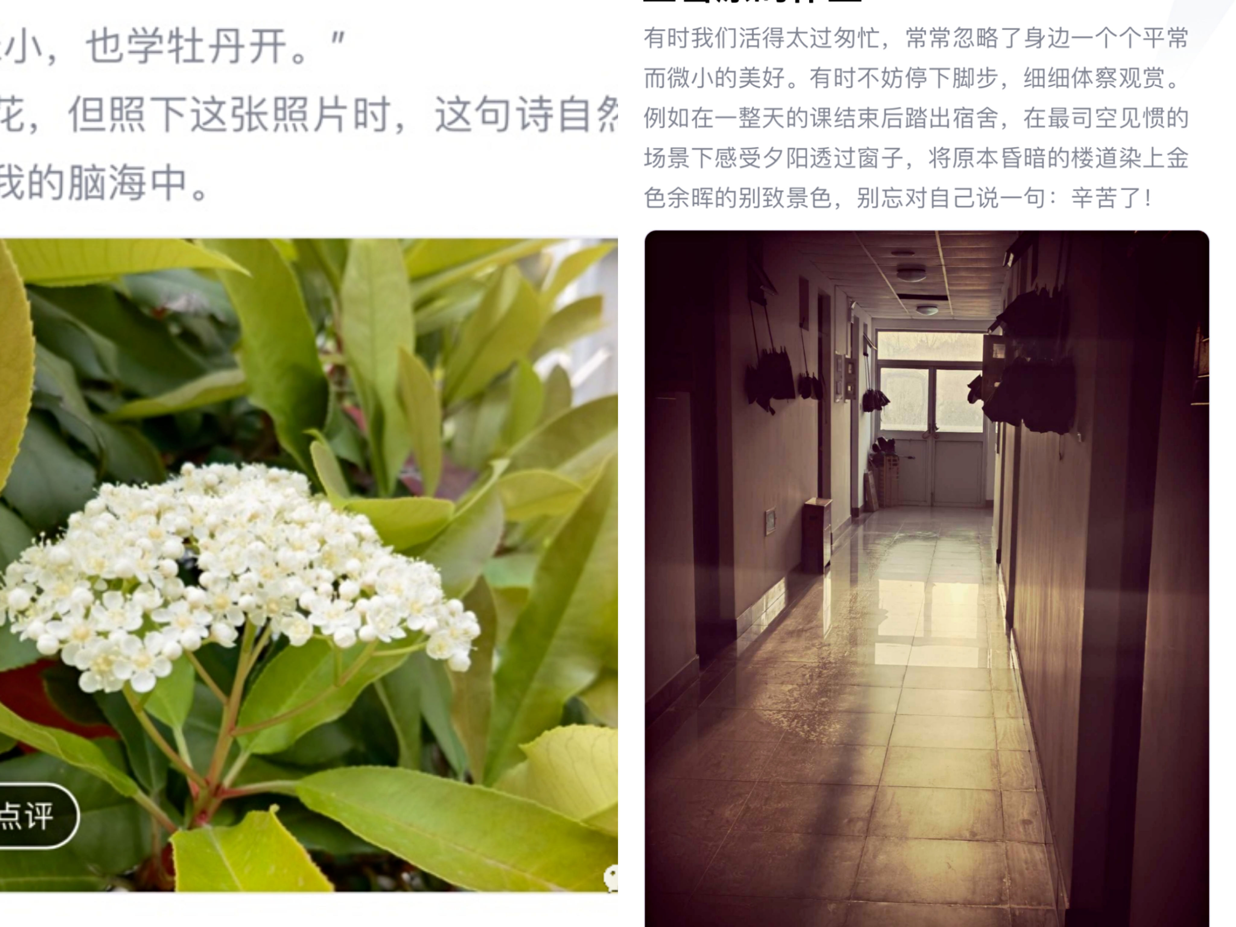 的确,这次打卡活动本身就如同之前举办过的每一个活动一样,走着它固有的流程,与每一个成功举办的活动相比都会黯然失色,像是一个不起眼的石子。但是石子也会遇见一片清澈见底的静水,参与的同学带给了它不同于以往任何一次活动的意义。于是它便也给出了专属于它自己的反馈,哪怕这一份反馈对每一个人来说似乎都不尽相同。对于活动工作人员来说,是见到了更多文化艺术的沧海遗珠;对于参与者来说,是看见了疫情之下封闭之中隐藏的更多的可能性,还有以前不曾发现过的校园的美。