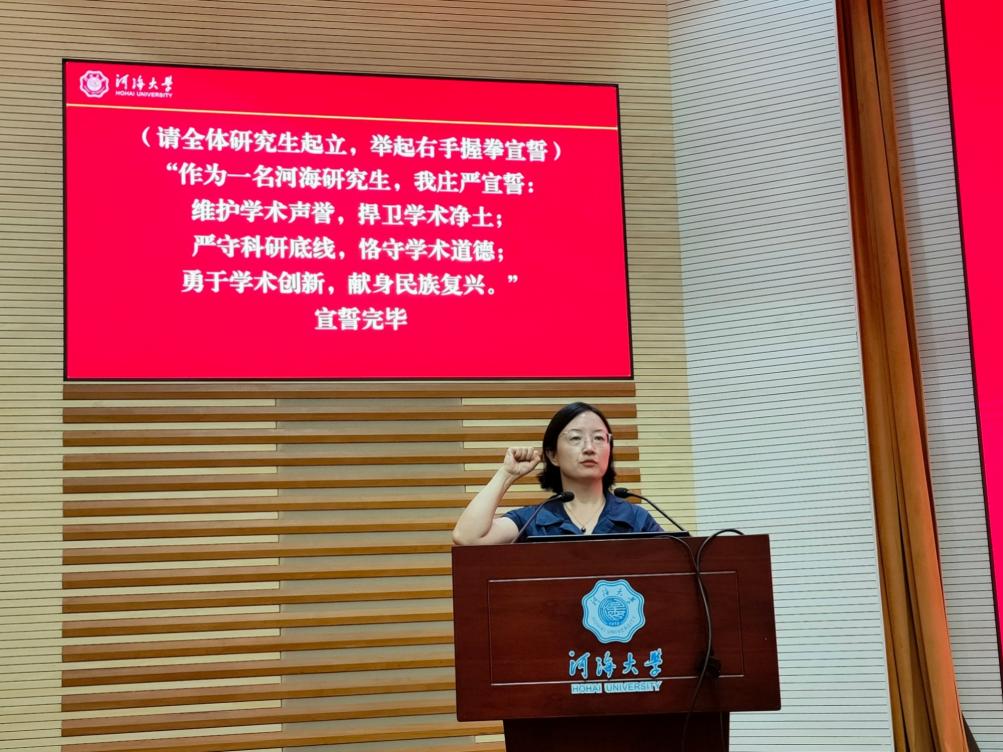 戴玉珍副书记带领全体新生进行学术诚信宣誓。通过宣誓,戴书记希望同学们能够铭记作为一名河海大学云顶国际yd333的研究生的责任与担当。勇立潮头,敢为人先,为中华民族伟大复兴事业奉献终生!因为有你,环境更美。