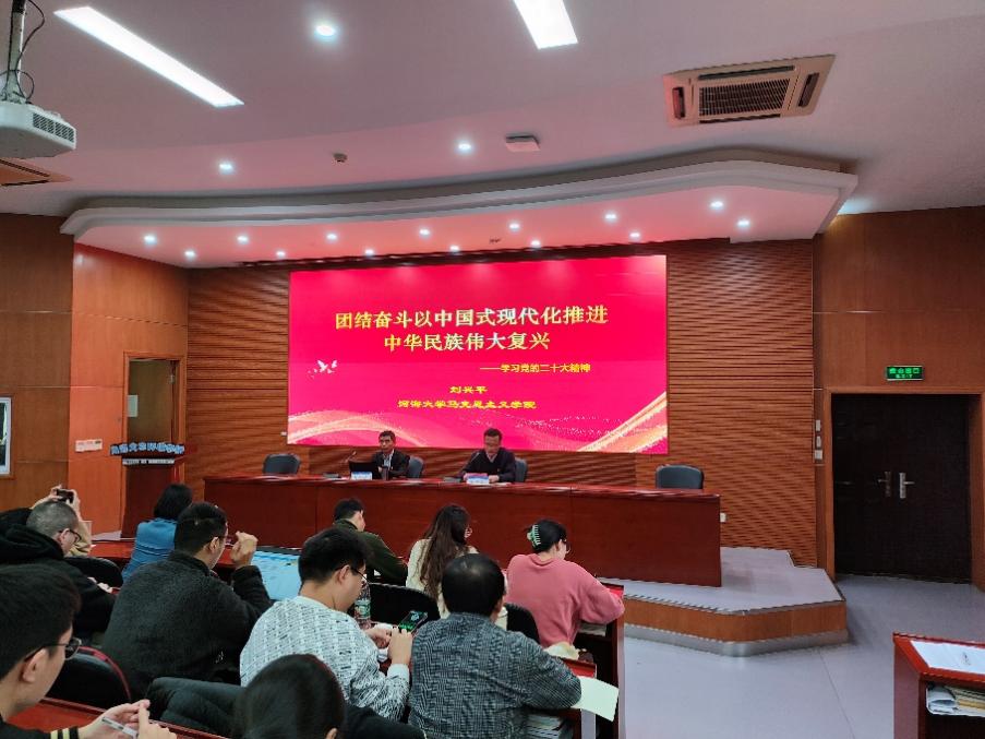 刘兴平书记以“团结奋斗以中国式现代化推进中华民族伟大复兴”为题,从党的二十报告内容的逻辑框架,党的二十大主题与“三个务必”、“两个行”、“两个结合”、“六个必须坚持”,以中国式现代化全面推进中华民族伟大复兴的新使命和向第二个百年目标进军的新征程等五个方面进行二十大精神的解读。同时刘兴平书记用新的伟大奋斗创造新的伟业作为结语,告诉全体师生需要全面学习、全面把握、全面落实党的二十大精神。其中刘兴平书记重点指出学习党的二十大报告精神要领会“六个牢牢把握”:其一,牢牢把握“两个确立”的重大政治意义;其二,牢牢把握过去5年和新时代10年伟大变革的伟大成就;其三,牢牢把握新时代中国特色社会主义思想的世界观和方法论;其四,牢牢把握中国式现代化推进中华民族伟大复兴的使命任务;其五,牢牢把握以伟大自我革命弓|领伟大社会革命的重大要求;其六、牢牢把握团结奋斗的时代要求。