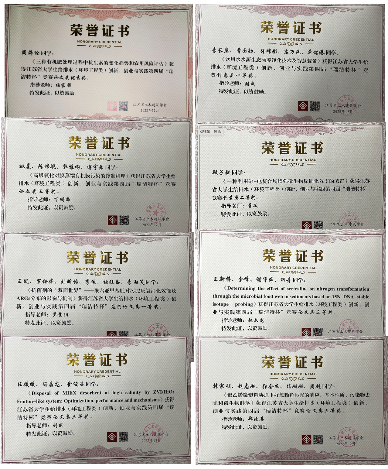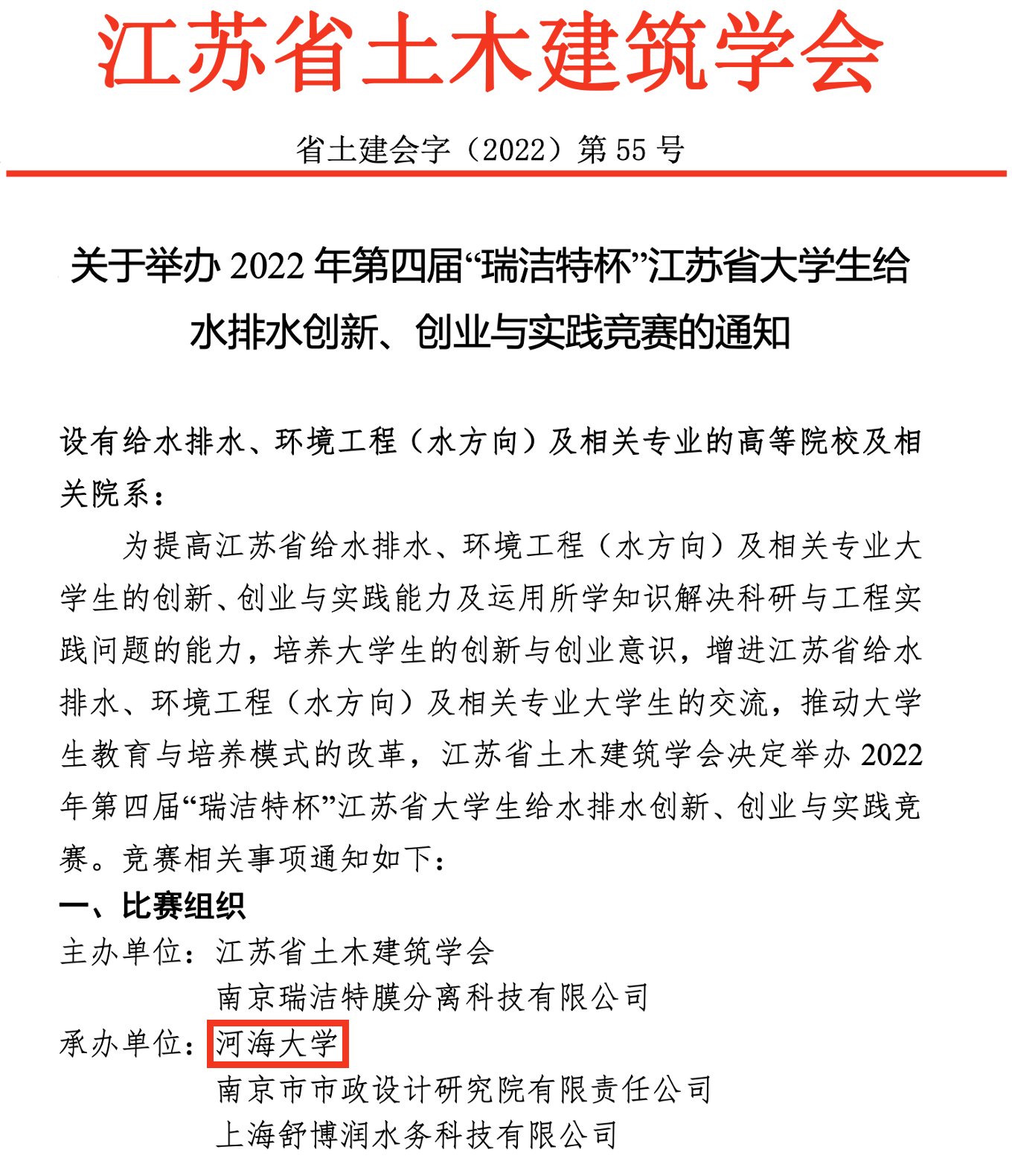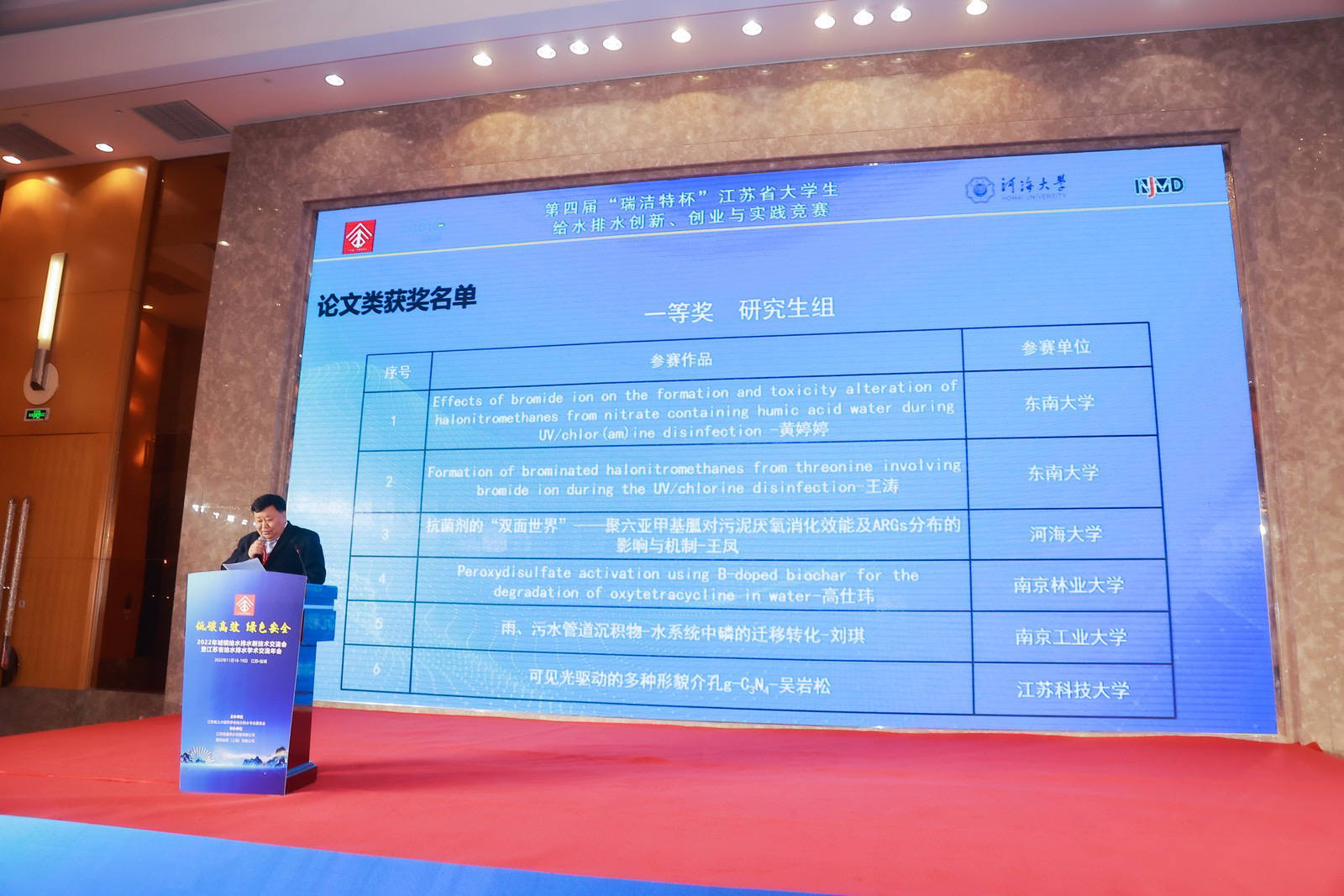 2022年11月18日,由我校承办的第四届“瑞洁特杯”江苏省大学生给水排水创新、创业与实践竞赛颁奖典礼暨闭幕式在江苏盐城举行。本次大赛由江苏省土木建筑学会、南京瑞洁特膜分离科技有限公司主办,河海大学云顶国际yd333为主要承办单位。本届竞赛共收到全省20所院校共计134项作品。