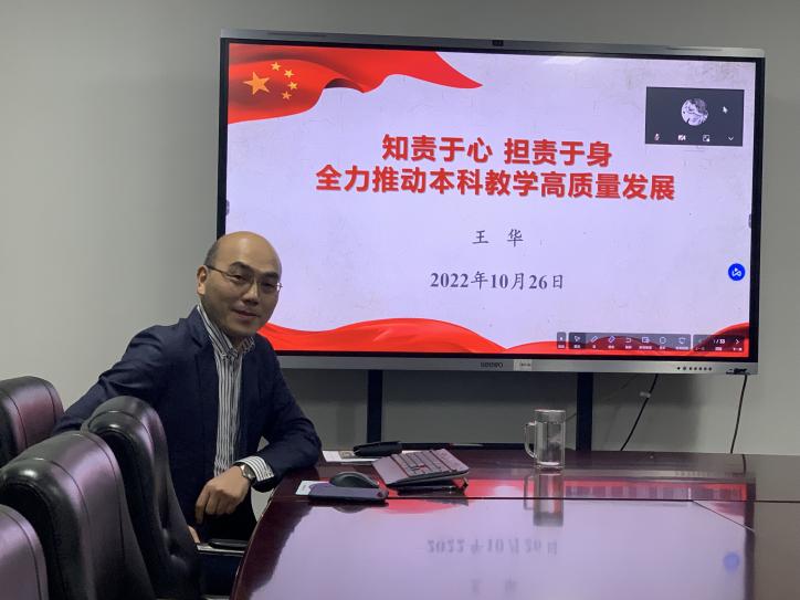 2022年10月26日,我院举办了师德师风专项活动,活动由我院王华副院长主持,主题为《知责于心,担责于身-全力推动本科教学高质量发展》。